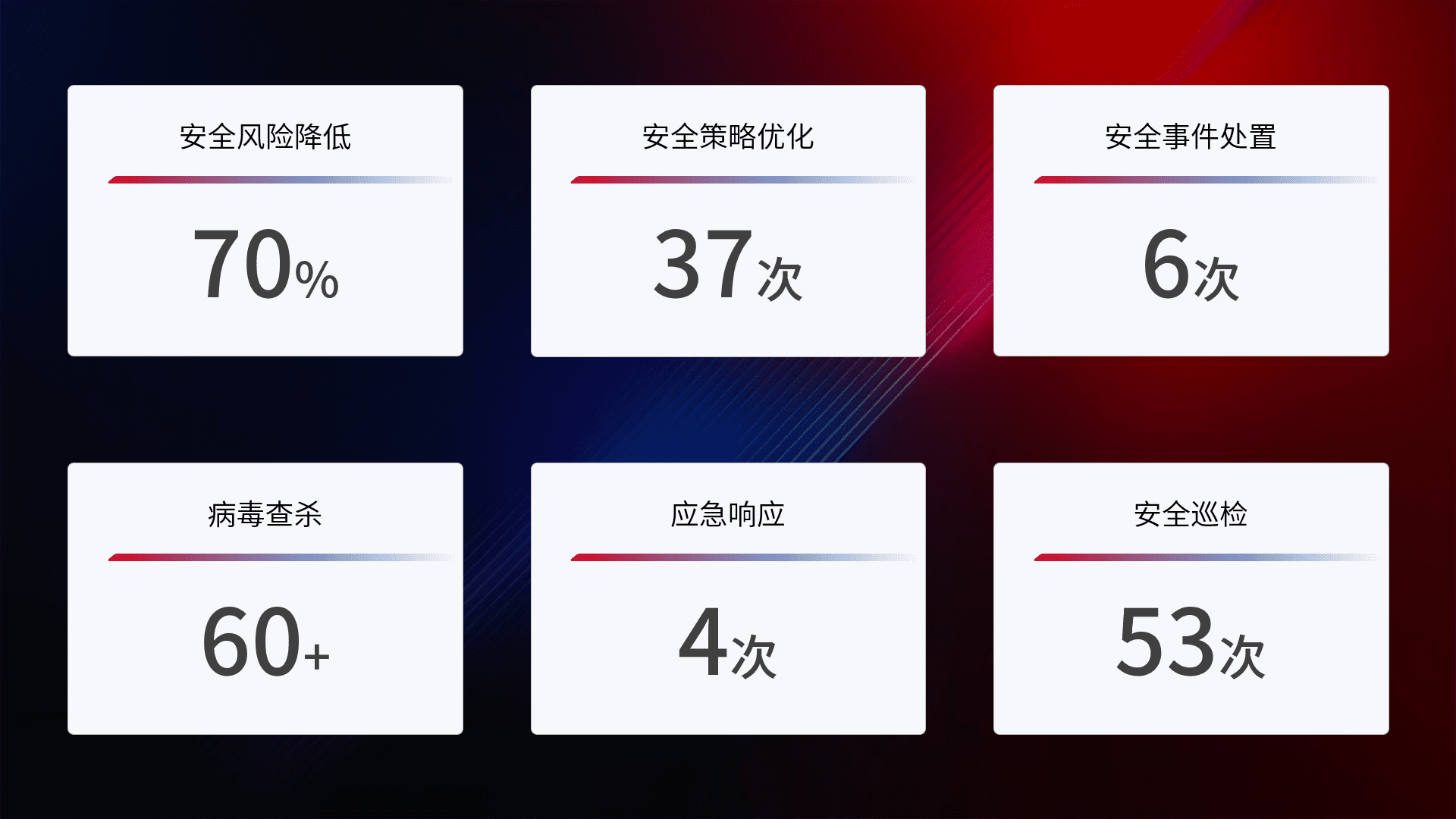 提供全面的安全事件报告体系,,,包括处置报告、、、、周报、、季度和年度总结,,结合持续监控,,,,帮助客户深入了解网络安全状况。。。。