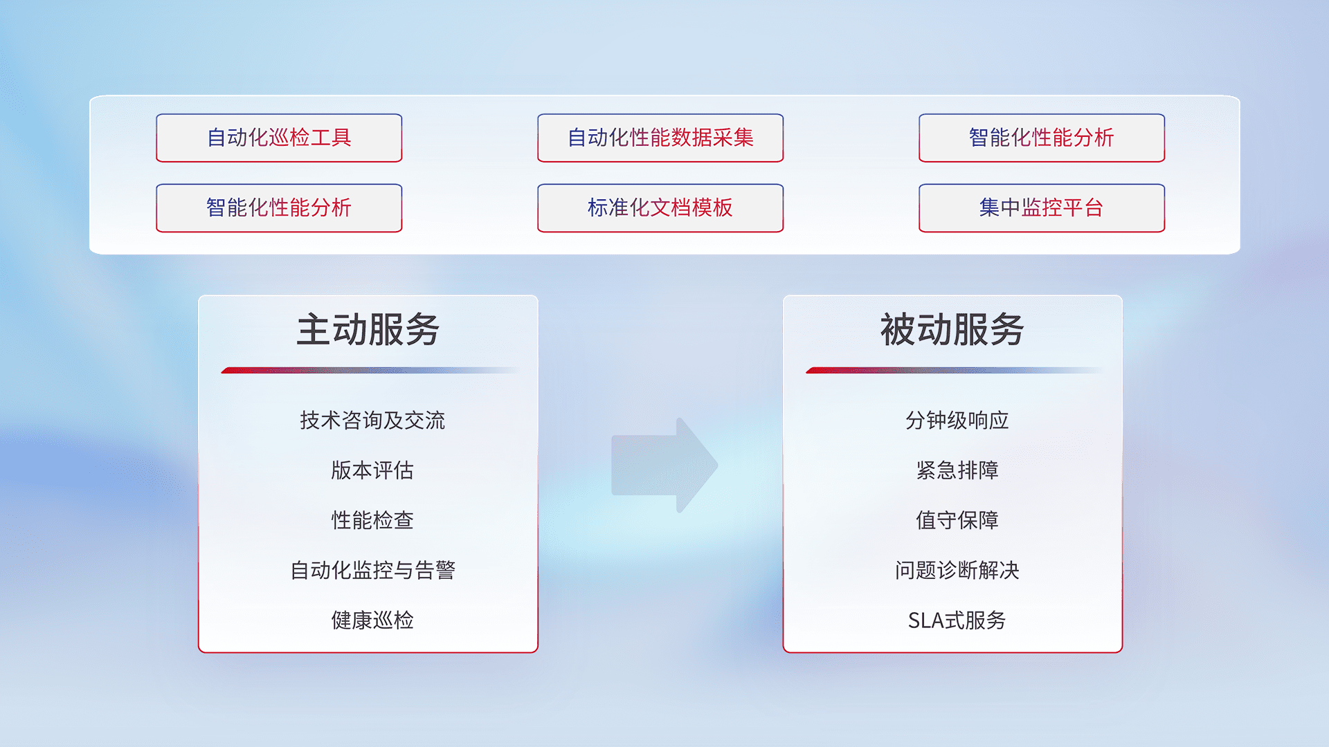 智能化工具和标准化文档,,保障服务质量,,提供主动服务(包含技术咨询、、、、版本评估、、性能检查、、、、自动化监控与告警、、、健康巡检)和被动服务包含(分钟级响应、、、紧急排障、、值守保障、、、、问题诊断解决、、、SLA服务)。。