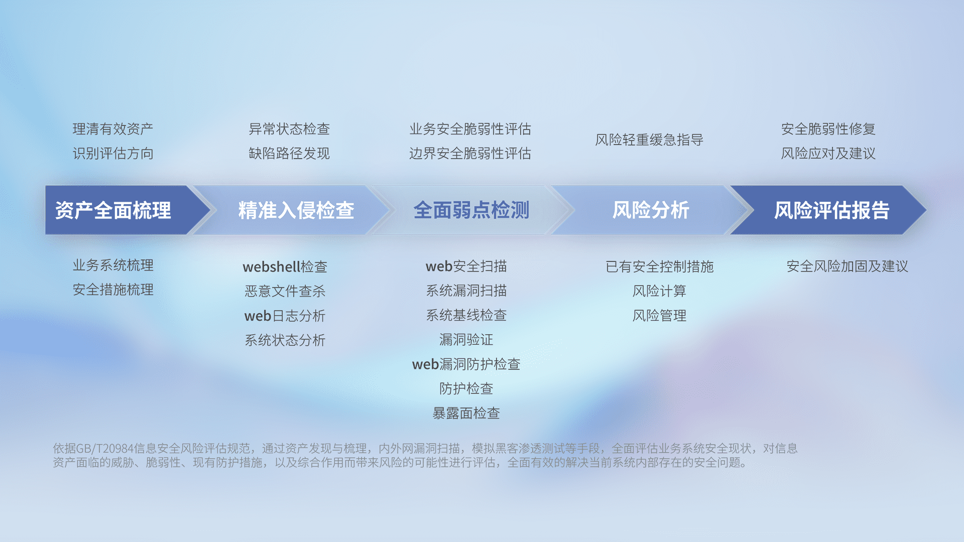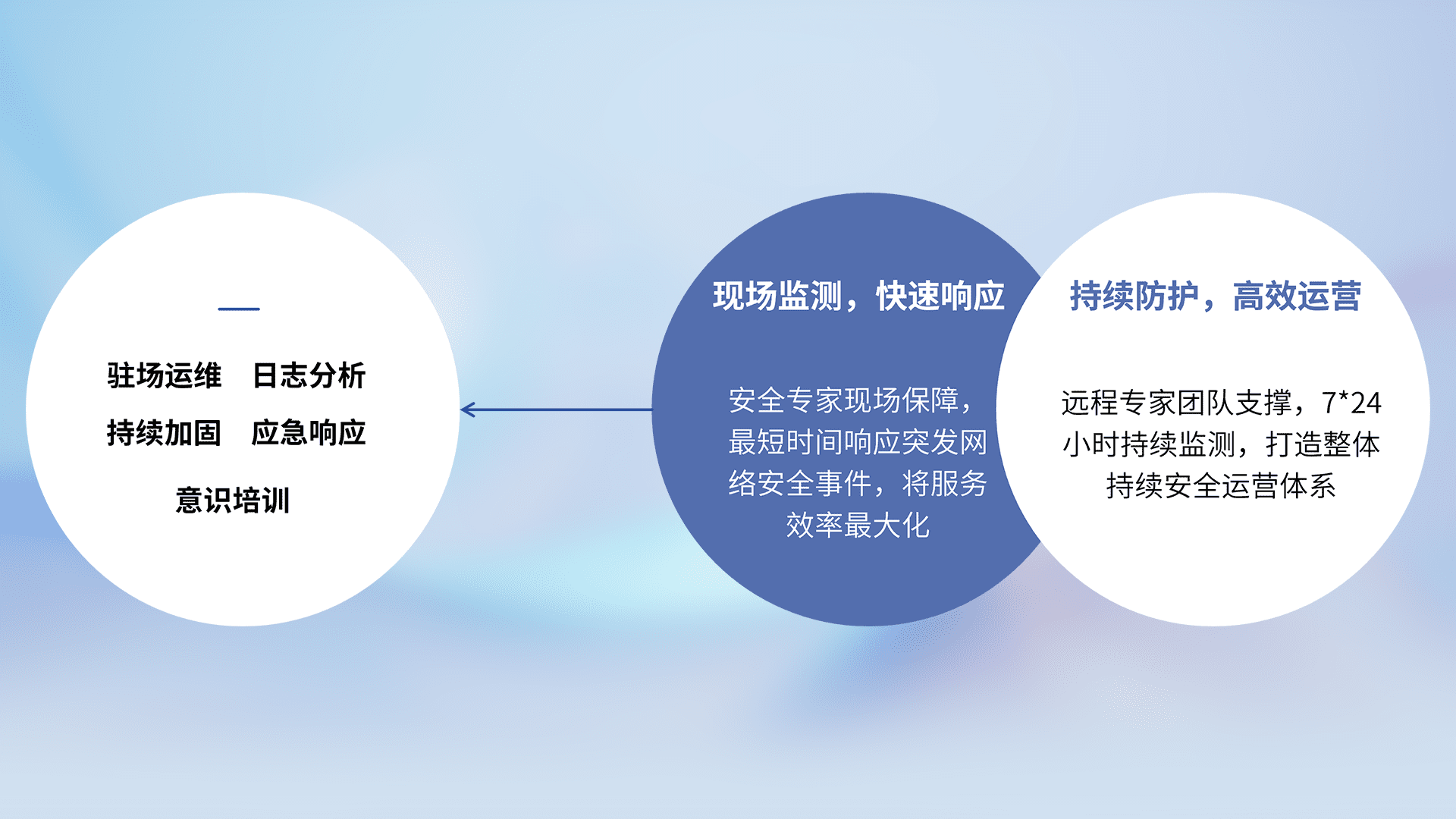 针对客户行业特性,,,以专业的安全服务+多厂商联合解决方案提供专属的一站式安全管理服务,,,帮助客户全面感知网络空间威胁,,基于识别、、检测、、、分析、、、防护、、监测、、、、响应的服务理论模型,,从方案咨询、、集成交付、、、评估验证、、优化加固、、、、运维运营,,,,致力于为客户提供完整的闭环管理式安全服务。。。以实战经验为客户打造高抵御风险的安全体系,,,,帮助客户发现威胁、、、对抗威胁、、处置威胁,,,不断积累安全对抗能力,,,,持续保障数字化安全。。。。